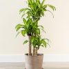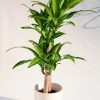 Thân cây gỗ chắc khỏe, lá dài mềm mại, màu xanh tươi viền vàng óng giúp không gian trở nên sinh động và cao cấp.